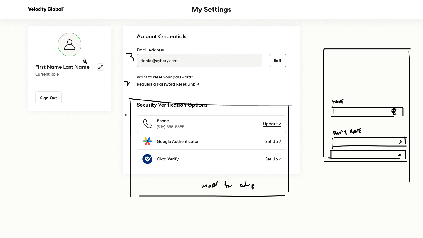 The prototype we tested explored a very polished and accelerated sign-in workflow and an account settings page where users could manager their user name, password, and MFA methods - something we've never had!