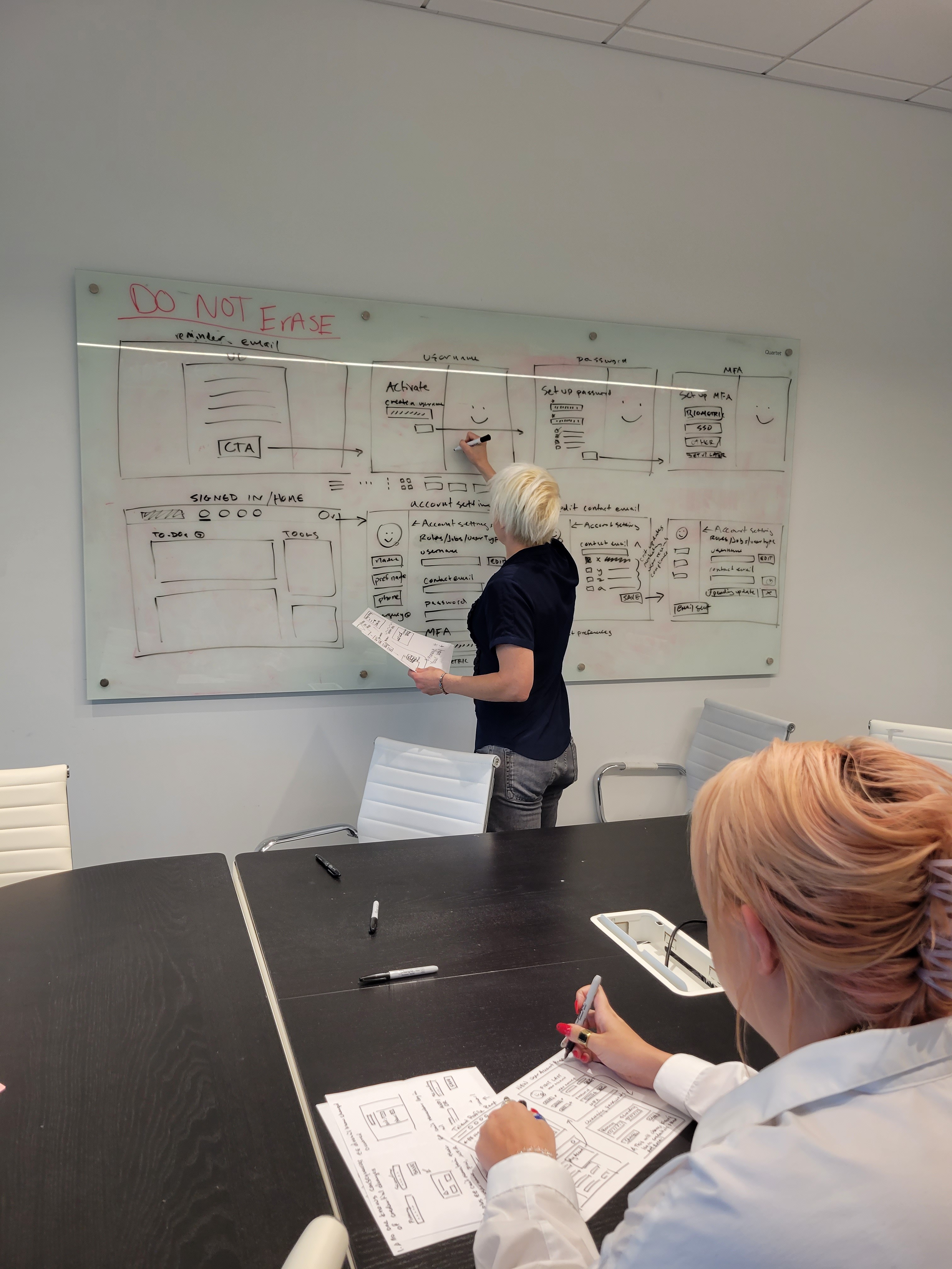 The first day of our workshop, planned and lead by our Product Manager and by me as a Design Sprint SME, consisted of presenting the foundational research performed by the UX Research team (including Personas and a sign-in Journey Map), running some classic Ideation exercises (Doodle Boot Up, Crazy 8's, Solution Sketch, and Art Gallery. We also synced up to clarify the product vision, make sure we were all aligned on the problems, and begin to accelerate our decision-making.